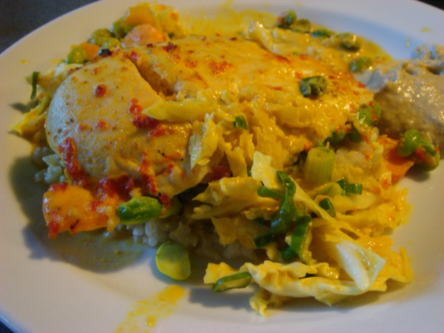 Kyllingen renses og lægges i en fad, oven på lægges: fint snittet savoykål, forårsløg i skiver, gulerødder i skiver og eddermaneme bønner. Kokosmælken røres sammen med chilipestoen og karry. Alt efter hvor krydret man kan lide det tilsætte mere eller mindre af krydderierne. Der smages til med salt og peber. Blandingen hældes ud over grøntsagerne og det hele sættes ind i ovnen og bager ved 175 grader varmluft i 30 min. Skær i kyllingen hvis du vil være sikker på at den er nok. Der koges ris til.