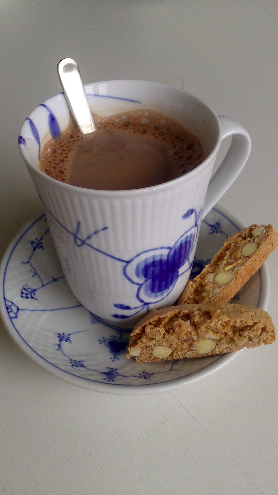 Nogen gange får man bare en trang til et eller andet bestemt. I dag var trangen til biscotti. Da jeg ikke drikker kaffe dypper jeg som regel mine biscotti i varm kakao eller som i dette tilfælde i min helt egen opfindelse chai-choco-latte, som består af halv chailatte-pulver og halv kakaopulver. Så føler jeg egentligt ikke at jeg går glip af noget ved ikke at drikke kaffe.
